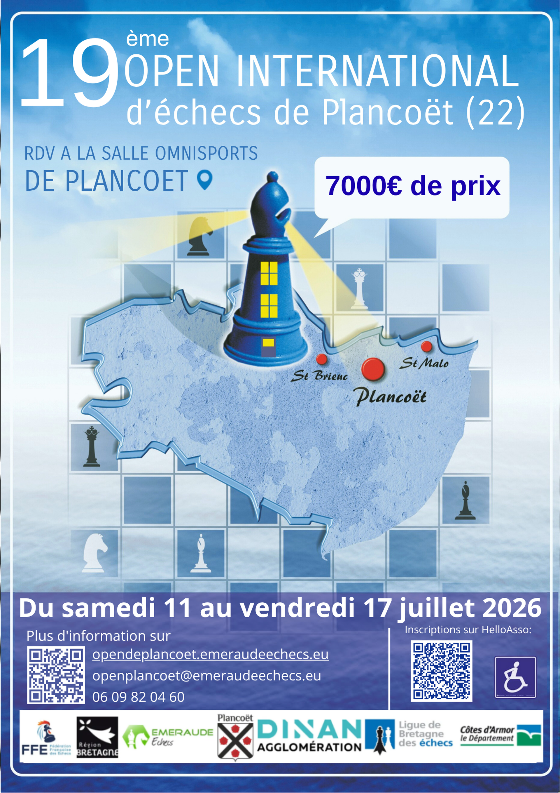 Emeraude Echecs is happy to welcome you for the 18th Plancoêt Open. It will take place from July 27 to august 02, 2025. Registration is open at all levels on HelloAsso.